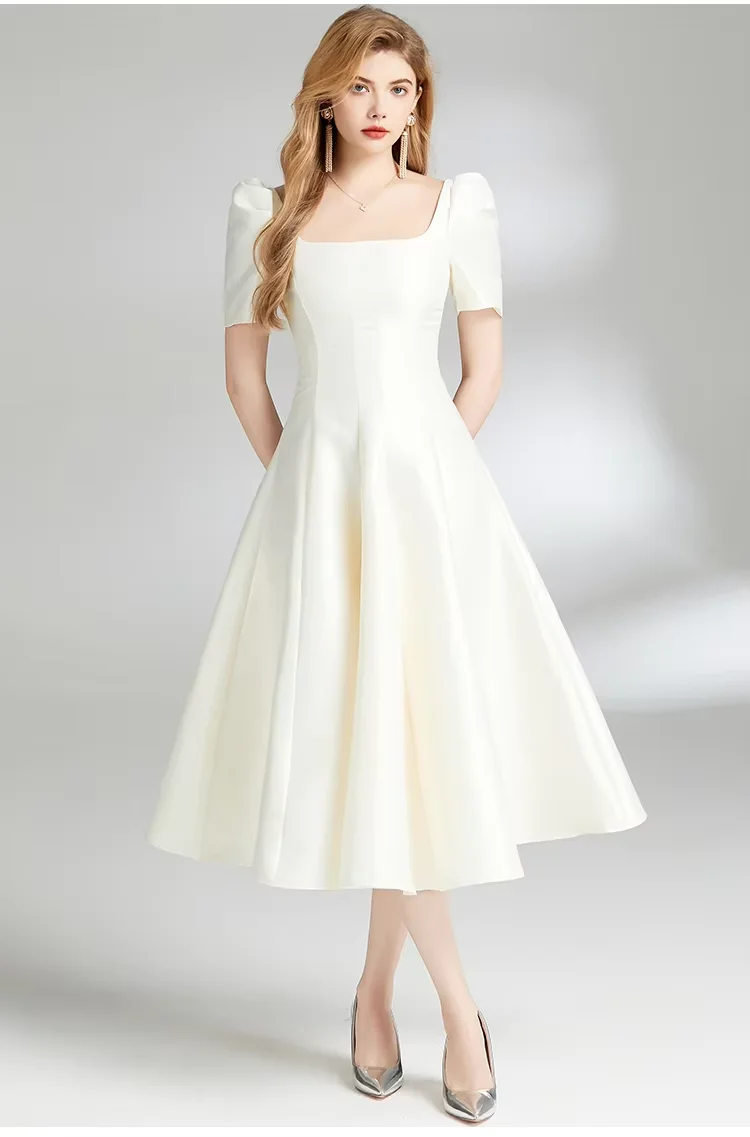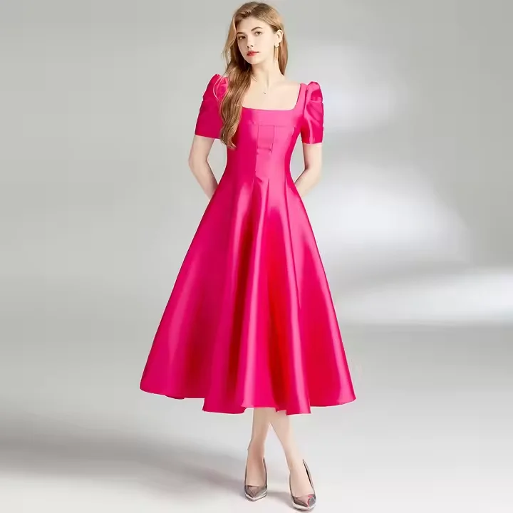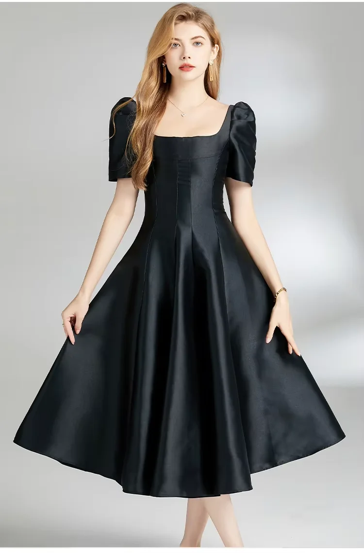 Women's Elegant Floral One-Piece Dress with Powder Puff Sleeve Square Neck and Slim Fit Natural Waist Midi Length Worsted Fabric